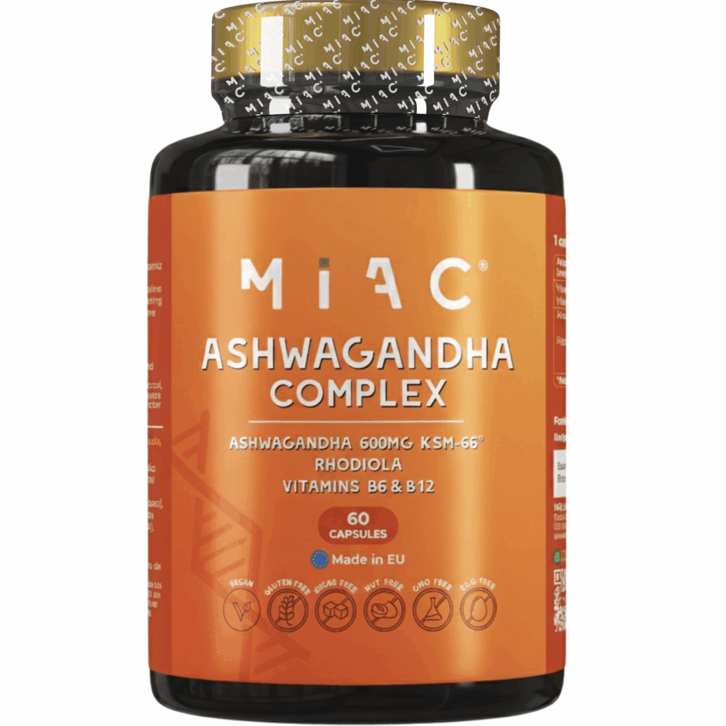 La Ashwagandha Complex KSM-66 es una fórmula avanzada que combina extracto de ashwagandha de alta concentración (5% de withanolides) con vitaminas B6 y B12 y extracto de Rhodiola, diseñada para ayudar al organismo a mantener el equilibrio físico y mental frente al estrés y la fatiga. Cada envase contiene 60 cápsulas, con una dosis diaria recomendada de una cápsula.